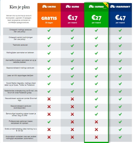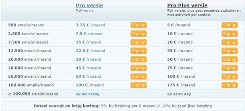 Abonnees variëren tussen de 80.001 en 110.000, de e-mails variëren tussen de 1.020.000 en de 1.320.000 en de maandelijkse kosten variëren tussen de 425 dollar en 525 dollar per maand.